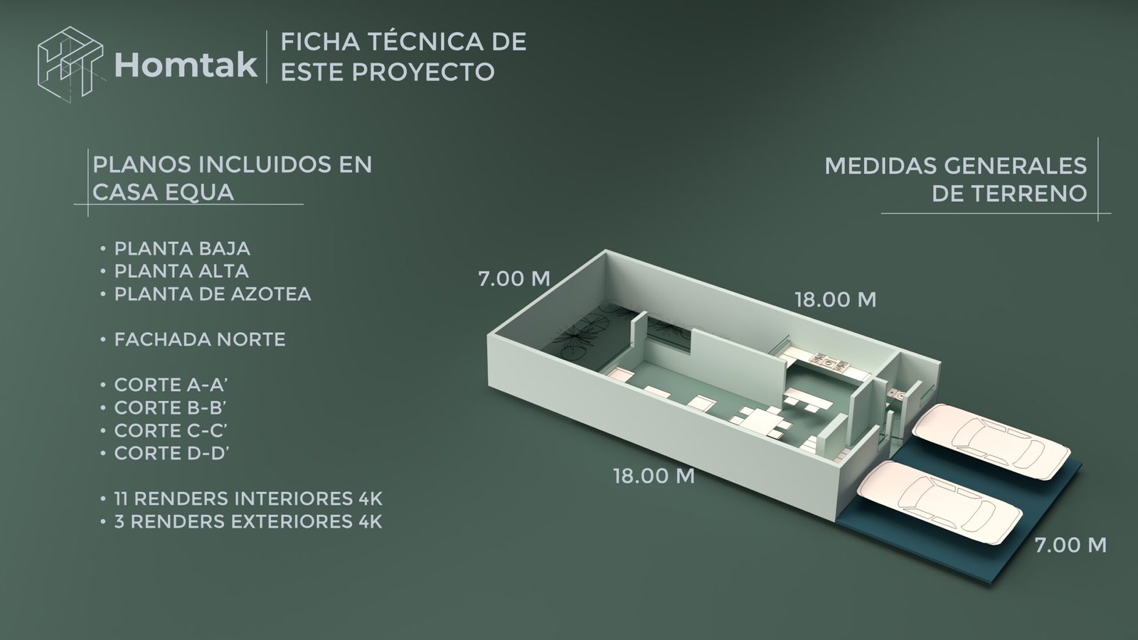 Verás todas las láminas, el archivo DWG editable, renders y otros elementos que incluye un proyecto Homtak.
