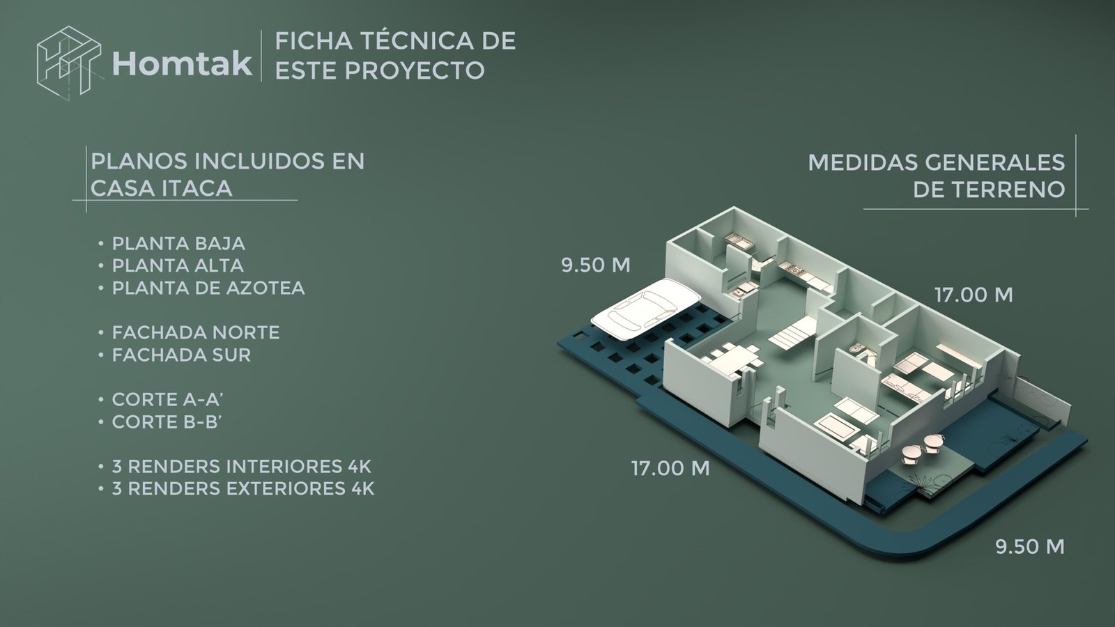 Verás todas las láminas, el archivo DWG editable, renders y otros elementos que incluye un proyecto Homtak.